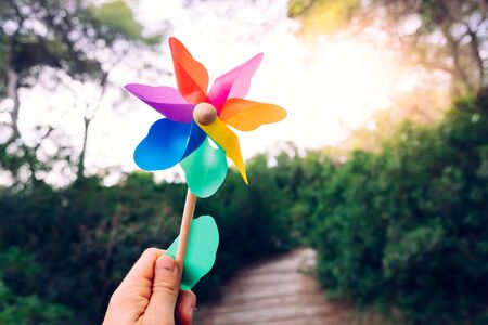 Hand holds a toy pinwheel, concept of inspiration and dreams in freedom.