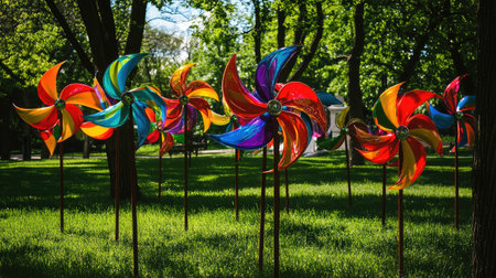 A collection of vibrant pinwheels spinning in the breeze at a sunny park.