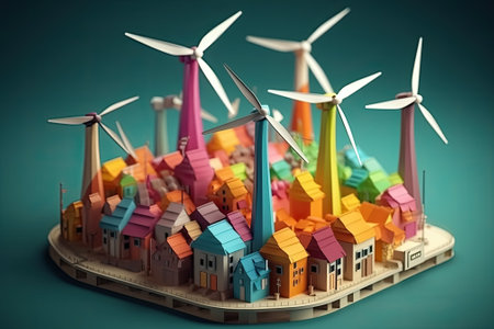 Eco friendly and save energy concept design. Urban countryside and cityscape of environment conservation paper art style. wind turbines. AI generative