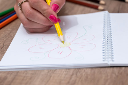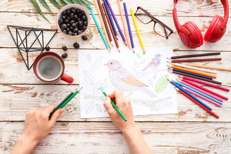 Image of woman coloring, adult coloring book trend, for stress relief. top view. colorer - antistress with colored pencils. Adult coloring books. The woman draws thereby relieves stress