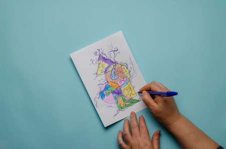 Mental health, a modern method of art therapy, Neurographics. The hands of an adult woman draw an abstract multicolored drawing on a white sheet of paper. Selective Focus.