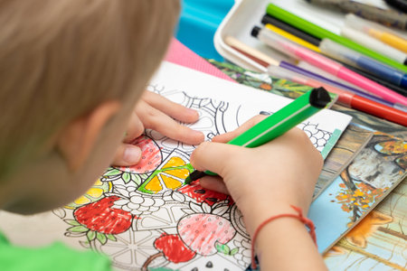 Over the shoulder: a boy learns to color a coloring book with fruits and vegetables with a green felt-tip pen. Development of creative thinking at home