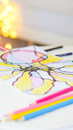 A female painting mandalas to combat stress caused by confinement to prevent coronavirus COVID-19