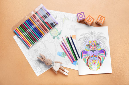 Coloring pages, felt-tip pens, pencils and toys on beige background