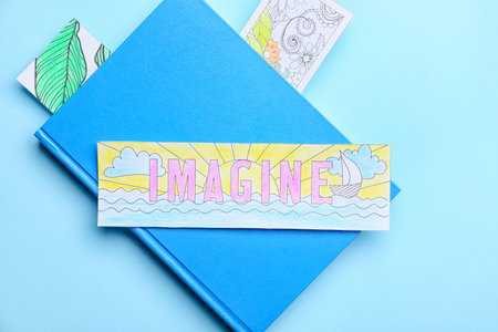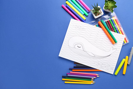 Coloring pages, pencils, eyeglasses and headphones on blue background