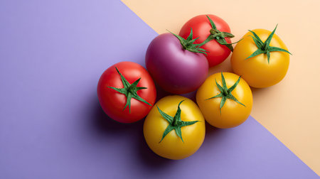 A stunning arrangement of fresh tomatoes in vibrant colors of red, yellow, and purple on a split color background, perfect for cooking or healthy eating themes.