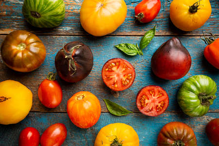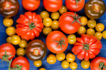 Mixed tomatoes top view. Composition with variety of colorful fresh organic tomatoes.