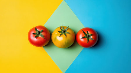 This vibrant image features fresh tomatoes in red and yellow shades placed on a colorful geometric background. Ideal for culinary and food-related projects.