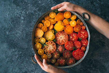 Heirloom tomatoes collection on black wooden background. Colorful tomatoes vatieties.