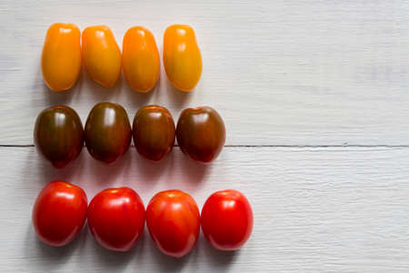 Three rows of different sorts of cherry tomatoes. Yellow, red and green. Organic ripe tomato on wooden table, top view