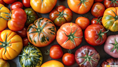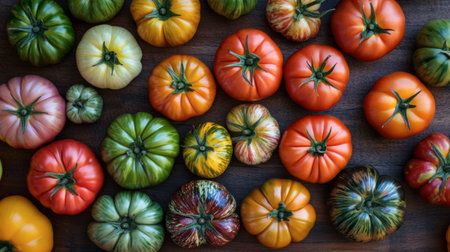 A medley of ripe heirloom tomatoes in various hues from deep purples to sunny yellows each with unique patterns on their skins capturing the essence of organic diversity