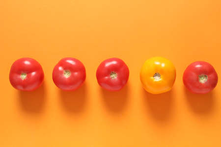 Yellow tomato among red ones on color background. Concept of uniqueness