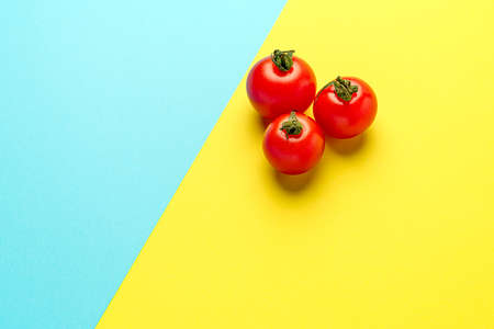 Red tomato ingredients isolated on colored background. Seasonal vegetables in modern style. Copy space. Top view