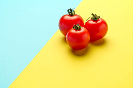 Red tomatoes on a twig on a blue background. Fresh vegetables from the garden. Vegetarian food.