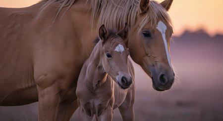 A baby horse stands next to its parent, showcasing the bond and size difference between the two equines, A heartwarming scene of a horse with its foal in a barn, AI Generated