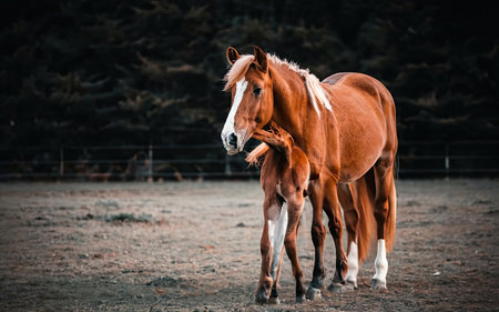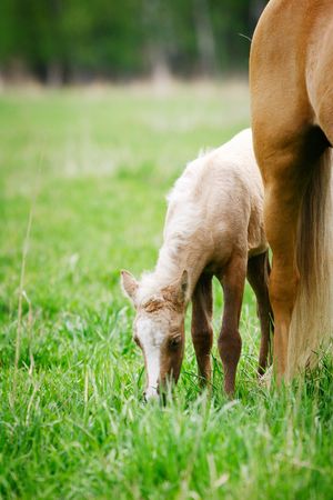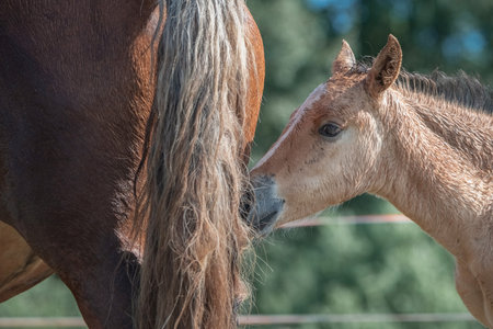 Funny photo of newborn foal and mother mare on green meadow. Mare is wagging her tail.