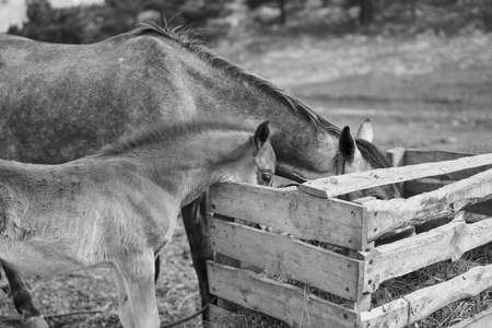 Shy cute chestnut foal standing next to a huge haystack, looking furtively at her mother, at the muzzle which is wearing the halter