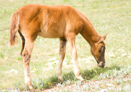 The picture shows a small foal,a field,grass,sky.Foal grazing in the meadow.