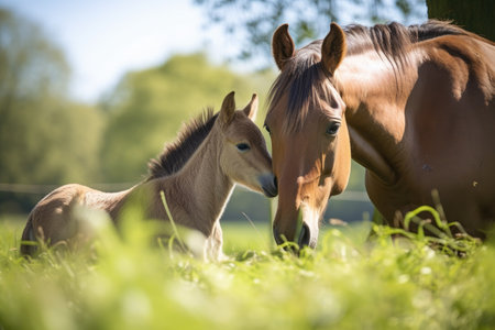 newborn horse being cared for by mother in sunny meadow, created with generative ai