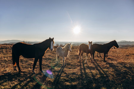Horses at sunset in the field. Warm artistic tinting