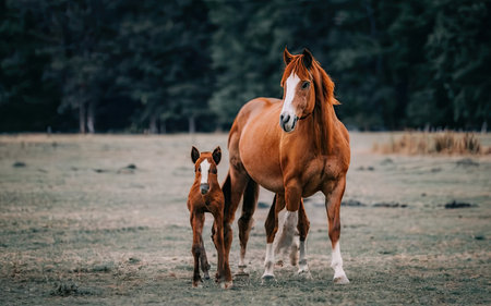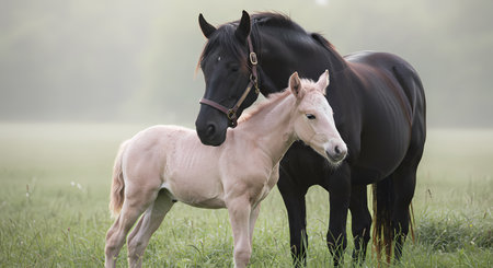 A charming young foal stands confidently next to an adult horse, showcasing their bond in a tranquil natural setting surrounded by soft grasses and warm light.