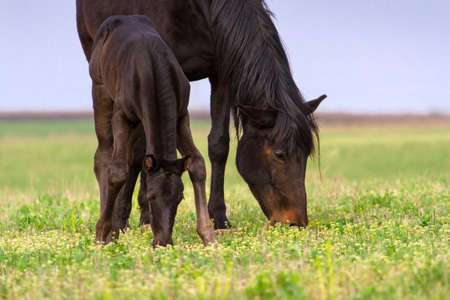 Foal with mother in the meadow at sunset. Selective focus.