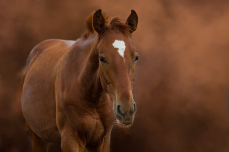 Portrait of English thoroughbred foal at sunset looking at the camera. Light background with copy space.