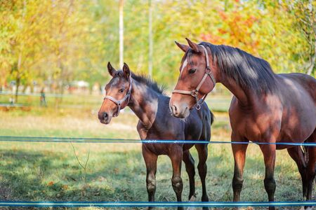 Portrait of a beautiful horse foal with mother