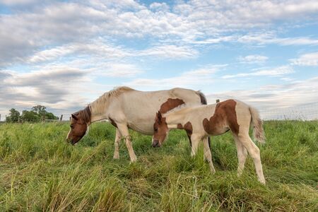 Foal and its mother in the pasture