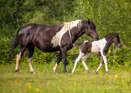 A black and white patterned mare walks alongside her young foal, both moving gently through a vibrant meadow filled with wildflowers under the warm sun.