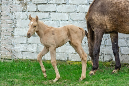 Portrait of newborn foal standing next to its mother mare on green meadow on sunny day.