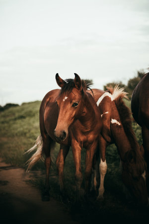Beautiful young foals in the meadow. Selective focus.