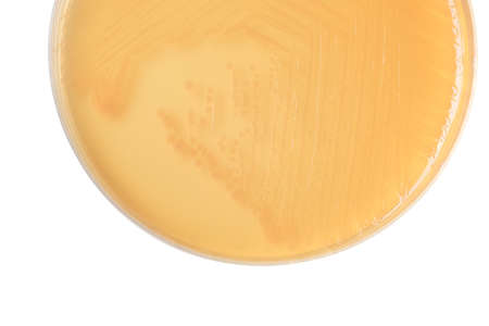 Microbiology laboratory yeast cultivation on agar medium plate, white background