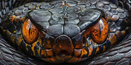 A close-up of the eyes of a dark-colored, frightening-looking snake. High quality photo