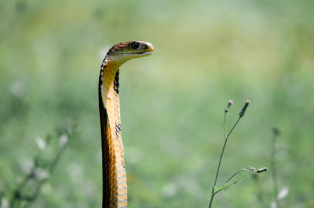 A king cobra rears up on a dirt path, displaying its hood. The snake's scales exhibit textures of brown and gray, with an open mouth. The scene is shot in natural lighting, and a green, out-of-focus hillside serves as the backdrop. Suitable for editorial and commercial applications.