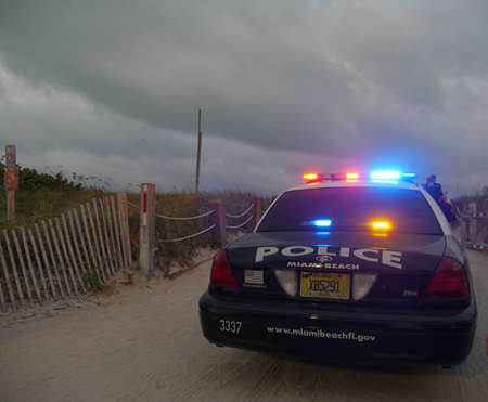Miami, Florida- December 2018: A police car with lights flashing at the Miami south beach during an event.