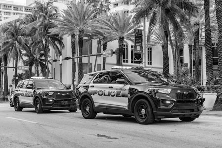 Miami, Florida, USA - November 18, 2024: Police car Ford Interceptor in Miami, angle view. Ford Interceptor. Police car on the road. Emergency 911 service. Emergency vehicle of police 911