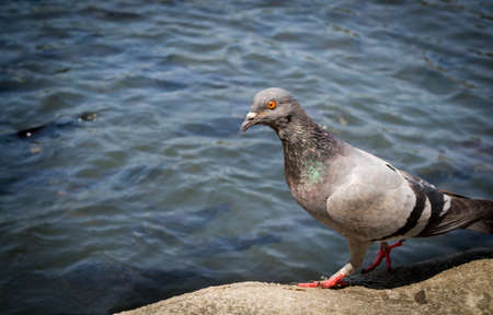 pigeon stand on rock near lake