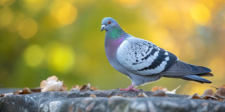 Pigeon on the ground in the park with autumn leaves.