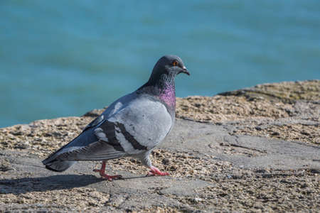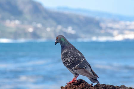 image with close-up of a common pigeon and with the sea in the background