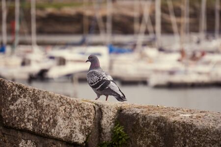 Urban pigeon sits on the ruins of a building on the background of the sea