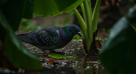 Pigeon drinking water in the rainforest. Bird in the rain.