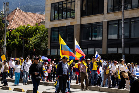 BOGOTA, COLOMBIA - April 21, 2024. March asking for Gustavo Petro impeachment. Peaceful protest march in Bogota Colombia against the law reforms of Gustavo Petro government.