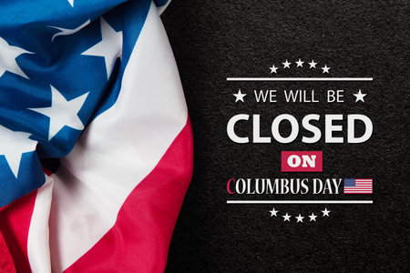 Columbus Day Background Design. American flag on background of sunset sky with a message. We will be Closed on Columbus Day.