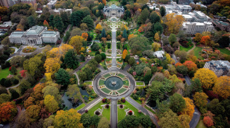 This aerial image captures a stunning view of a park's gardens framed by vibrant autumn colors, featuring a serene fountain and lush greenery.