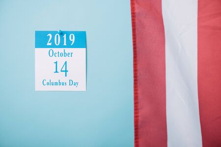 paper calendar with Columbus Day inscription near part of American national flag on blue background