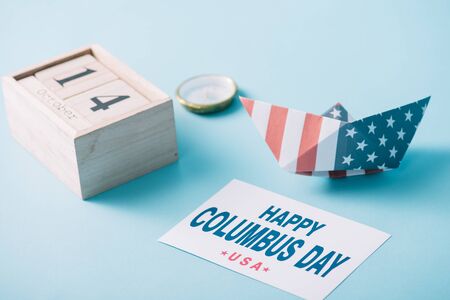 wooden calendar with October 14 date near paper boat with American flag pattern, compass and card with happy Columbus Day inscription on blue background