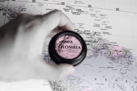 colorful view of colombia magnified with a magnifying glass, blurred background
