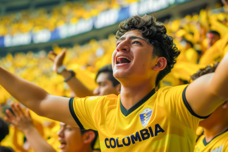 Colombia flags in their hands on a blurred urban background
