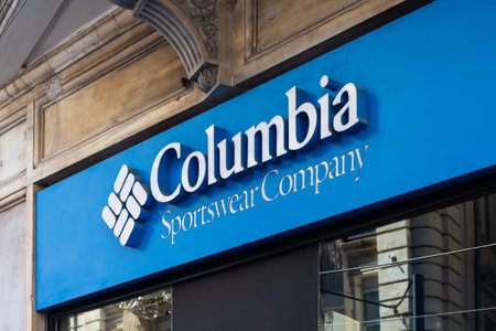 Villefontaine, France - September 13, 2019: Columbia sportswear company logo on a wall. The Columbia sportswear company is an American company that manufactures and distributes outerwear, sportswear